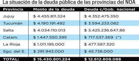 De las 6 provincias que integran la región, Jujuy, Tucumán y Salta son las más comprometidas en cuanto a su situación de endeudamiento, aunque hay que destacar que toda esa deuda no es exigible en lo inmediato, sino solo una parte. Del total de la deuda global de la región, más de $12 mil millones les corresponden a estas provincias. A su vez, estas tres provincias son las que más endeudadas están con la Nación, ya que sobre $12 mil millones que le adeuda todo el NOA, un total de $10 mil millones, son acreencias de estas tres provincias. En tanto, Catamarca y La Rioja suman una deuda global superior a los $2 mil millones mientras que Santiago es la que exhibe el perfil de deuda más bajo de toda la región, con acreencias a pagar por $ 291,9 millones, equivalentes a menos del 2% de la deuda global de la región.