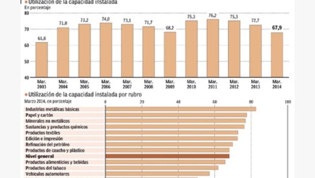 De acuerdo a los datos oficiales, en marzo el uso de la capacidad instalada se ubicó en 67,9%. Desde 2003, en los inicios de la salida de la crisis de 2001/2002, que el sector no presentaba tal grado de capacidad ociosa para el tercer mes del año. Si se toman los datos del primer trimestre del año, la utilización de la capacidad instalada en la industria alcanzó el 67,2%, casi tres puntos por debajo que en el mismo periodo de 2013, informó el Instituto Nacional de Estadística y Censos (Indec).