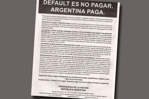 "Argentina quiere seguir dialogando en condiciones justas, equitativas y legales para 100% de los bonistas", finaliza la nueva solicitada, que concluye con el mensaje "Default es no pagar; Argentina paga. Es hora de dejar de mentir y especular".
