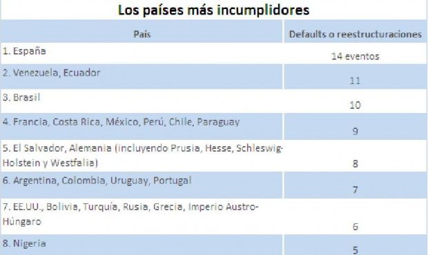 Afirmación que se fundamenta en el ranking de países con más defaults desde el siglo XVI elaborado a partir de datos compilados por Kenneth Rogoff y Carmen Reinhart, de la Universidad de Harvard, y otros investigadores como el economista Miguel Ángel Boggiano, de la Universidad de San Andrés en Buenos Aires, tabla que es encabezada por España, mientras que Argentina figura en el sexto lugar con 7 eventos junto a Colombia, Uruguay, Portugal, por debajo de El Salvador, Alemania con 8 default, y por arriba de . EE.UU., Bolivia, Turquía, Rusia, Grecia, con seis cesaciones de pago cada uno (ver gráfico).