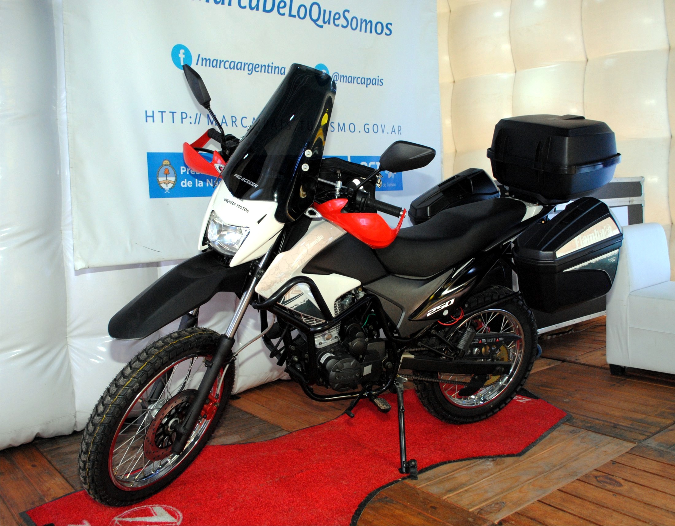 La moto, tiene un potente motor 250 centímetros cúbicos, contando además con defensas delanteras y un importante número de valijones que le servirán a quien la utilice para llevar gran cantidad de cosas en sus travesías.