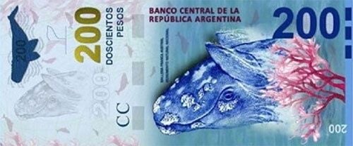 El de $ 200 recién fue puesto en circulación hoy. Es el único, junto con el anterior, que tiene diseño "vertical”. El anverso está ilustrado por una ballena franca austral.