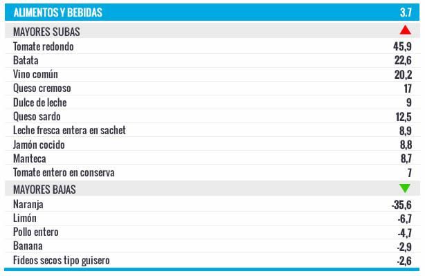 En el detalle, los productos que más subieron en ese rubro fueron: tomate redondo (+45,9%), batata (22,6%), vino común (+20,2%), queso cremoso (+17%), queso sardo (12,5). Mientras que la leche fresca entera en sachet, el dulce de leche, el jamón cocido y la manteca se encarecieron en torno al 9%, y el tomate entero en conserva subió un 7%.
