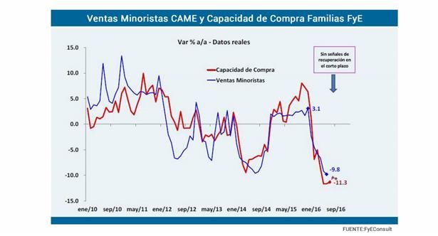 Agregó que esta "caída de la capacidad de compra de las familias (demanda doméstica) está explicando la retracción del consumo que se reflejó en los datos de ventas de CAME. En efecto, las ventas minoristas (CAME) registraron una disminución del -9,8% interanual en junio, siendo ésta la caída más pronunciada desde 2009 (pleno impacto de la crisis financiera internacional)".