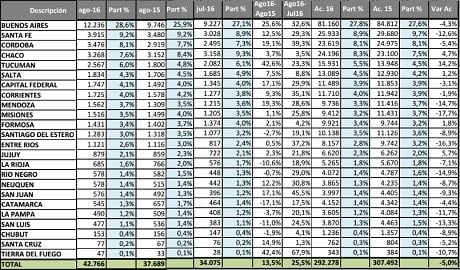 los ocho meses declinaron 4,3%; y en la Ciudad Autónoma de Buenos Aires 3,1 por