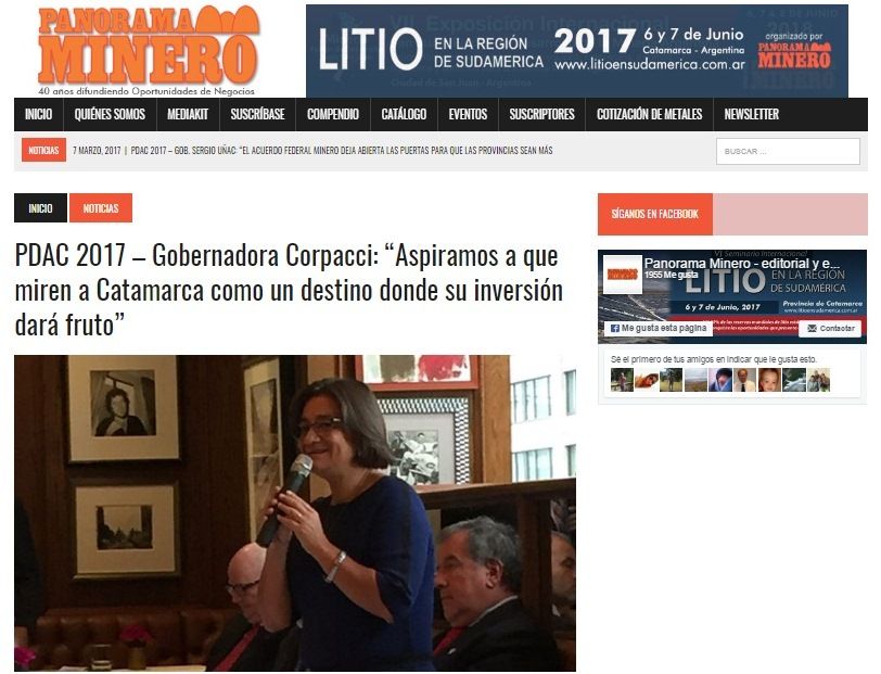 Así, en un segundo artículo titulado "PDAC 2017 – Gobernadora Corpacci: ‘Argentina tiene para el inversor algunas ventajas que no siempre se perciben’”, Panorama Minero señala en su portal digital que "el discurso de la Gobernadora de Catamarca en la presentación de Argentina en Toronto remarcó fuertemente el mensaje de unidad nacional”.