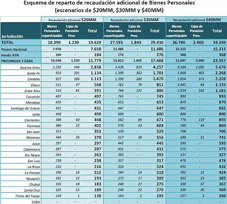 El IARAF estableció tres escenarios posibles, uno de máxima en el cual la recaudación de Bienes Personales crecería en 40 mil millones de pesos, uno de mínima en el cual esa cifra baja a la mitad y un tercer intermedio que estima un incremento de 30 mil millones. Por la forma en que se reparte ese tributo, a las provincias les corresponderían entre 11.700 millones y 23.500 millones.