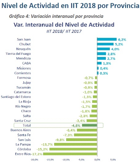 A nivel provincial Entre Ríos, Córdoba y La Pampa mostraron las mayores contracciones en el nivel de actividad relacionado con la performance del sector agrícola, ganadero, caza y silvicultura que se vio afectado por condiciones climáticas y aporta más del 30% de la actividad en dichas provincias. En sentido contrario, las subas más pronunciadas se dieron en San Juan (por la buena cosecha de vid) y Chubut (asociado a la mayor producción de petróleo).