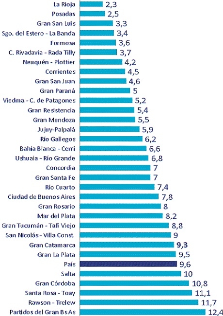 La región de Gran Buenos Aires (11,4%) presentó la mayor tasas de desocupación. En el Norte Grande el NOA muestra la mayor tasa de desocupación con 7,6%, mientras que en el NEA se observa la menor tasa de desempleo a nivel regional al registrarse un 4,1%.