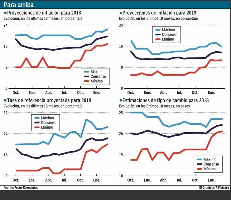 Por el lado de tipo de cambio, los pronósticos promedio ubicaron la divisa en $ 22,07 para fin de 2018. Esto significó un alza de 30 centavos respecto de las estimaciones conocidas en febrero. Los cálculos vienen mostrando aumentos en los últimos tres relevamientos realizados por Focus Economics. La última baja se había producido en la encuesta de diciembre (previa al cambio en las metas de inflación), en la que los analistas pronosticaban un dólar a $ 19,97 (desde $ 20,12 en noviembre) para fin de este año.