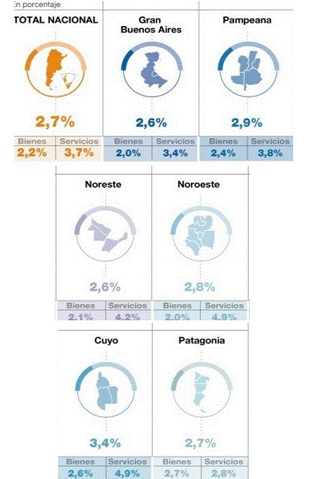 Cuyo registró el mayor porcentaje: 3,4%. La siguieron la región Pampeana (2,9%) y el NOA (2,8%), ambas por arriba de la media nacional. En la Patagonia los precios saltaron 2,7%, mientras que en el GBA y en el NEA aumentaron 2,6%.