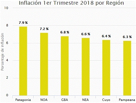 Solamente en el caso de la Patagonia el índice de precios fue superior, alcanzando el 7,9%. El estudio marca que en la región donde menor inflación se observó fue en la región Pampeana con un 6,3%.