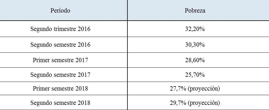 De cumplirse la proyección de dos puntos a junio y dos a diciembre de este año, puede esperarse una suba de la pobreza en el primer semestre de 2018 a 27,7%, cerca de los mismos niveles del año pasado y de 29,7% para el segundo, rozando la medición de diciembre de 2016. Es decir, los 2.700.000 personas que lograron salir de la pobreza y 610 mil que dejaron de vivir en la indigencia para fines del año pasado regresarán al mismo estadio y se sumarán más.