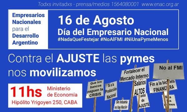 La convocatoria es a las empresas y los empresarios pymes, las entidades empresariales, y a los trabajadores en general, para acompañar la acción de protesta que “realizaremos, este 16 de agosto, a las 11hs frente, al Ministerio de Economía de la Nación, sito en Hipólito Yrigoyen 250, CABA”, reza la invitación.