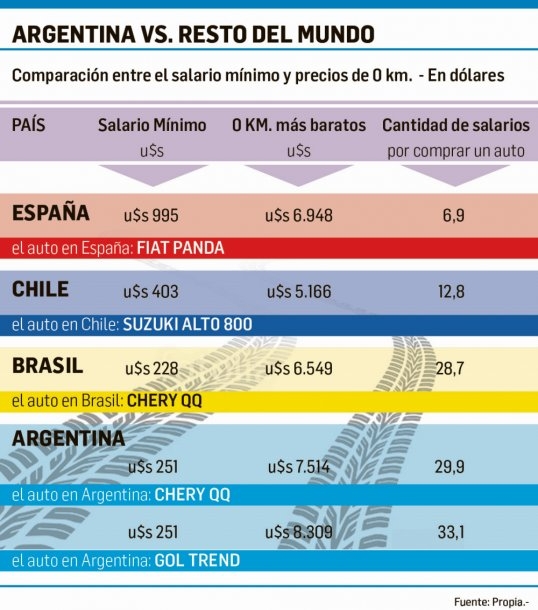 La cantidad de sueldos mínimos que se necesita está por encima de los que se requieren en Brasil para comprar el 0km más barato que, coincidentemente, es un QQ. En Chile, para adquirir el auto más económico, se necesitan 12,8 sueldos mientras que en España apenas 6,9 salarios.