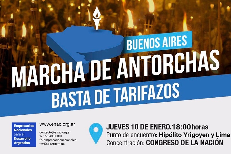En este sentido la última instancia que queda ante esta injusticia es la resistencia popular. Por todo esto llamamos a los empresarios con conciencia social a participar, en paz y al finalizar la jornada de trabajo, este Jueves 10 de Enero a las 18.30 hs., en la Marcha de las Antorchas contra los tarifazos junto con las organizaciones de pymes, de trabajadores, cooperativas, jubilados, docentes y estatales entre otros sectores. La misma partirá de la Avenida 9 de Julio y Avenida de Mayo hasta el Congreso de la Nación.