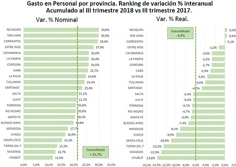 De acuerdo a los datos de la Subsecretaría de Relaciones con Provincias, del Ministerio del Interior, el gasto en personal del conjunto de provincias al mes de septiembre de 2018 fue equivalente al 5,32% del Producto Interno Bruto (PIB).