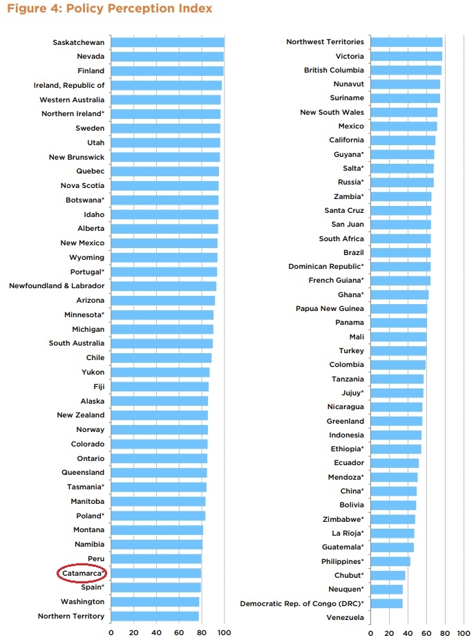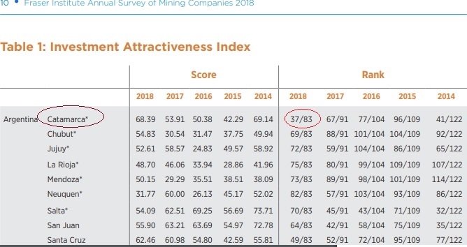 La provincia ocupa el lugar 38 a nivel mundial. “La provincia argentina de Catamarca es la jurisdicción mejor clasificada de la región en base a su entorno político. Catamarca vio un aumento en su puntaje de PPI (Índice de Percepción de Políticas) este año; subió cerca de 9 puntos en las calificaciones de los encuestados para seguridad, infraestructura y los acuerdos socioeconómicos y condiciones de desarrollo comunitario. Catamarca también vio una mejora de más de 10 puntos de 2016 a 2017”. Así presenta a la provincia el Informe Fraser 2018, dado a conocer en las últimas horas y que año a año se difunde antes de la feria minera mundial más importante del sector, que se realiza en el mes de marzo en Canadá.