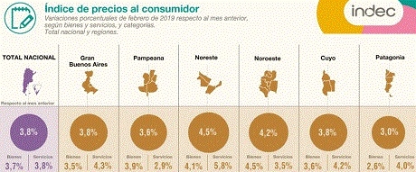 A escala nacional los precios minoristas avanzaron una suba de 3,8% en febrero y 8,1% en el primer bimestre, debido principalmente a los incrementos en alimentos y en servicios públicos.