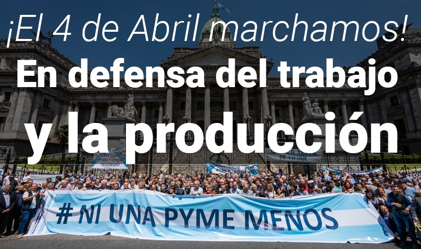 “Las organizaciones de las Pequeñas y Medianas Empresas nos movilizamos este 4 de abril a las 12 hs desde Plaza Once, CABA, junto con los trabajadores, los cooperativistas y organizaciones sociales para defender nuestras empresas y los puestos de trabajo ante el profundo deterioro económico y social que provoca el actual modelo económico.