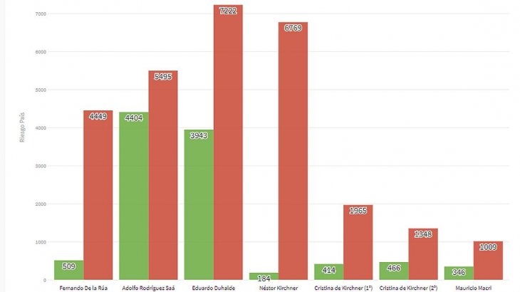 En los últimos 20 años de la Argentina el Riesgo País tuvo un pico máximo de 7.222 en agosto de 2002 y un mínimo de 342 en el segundo mandato de Cristina de Kirchner.
