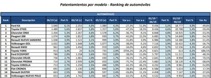 La compañía alemana Volkswagen se quedó con el sexto lugar al comercializar 1.022 vehículos del modelo Gol, apenas por debajo de los 1.077 de mayo, mientras que Renault también aparece nuevamente, esta vez en el séptimo lugar con el KWID y unas 961 unidades vendidas.