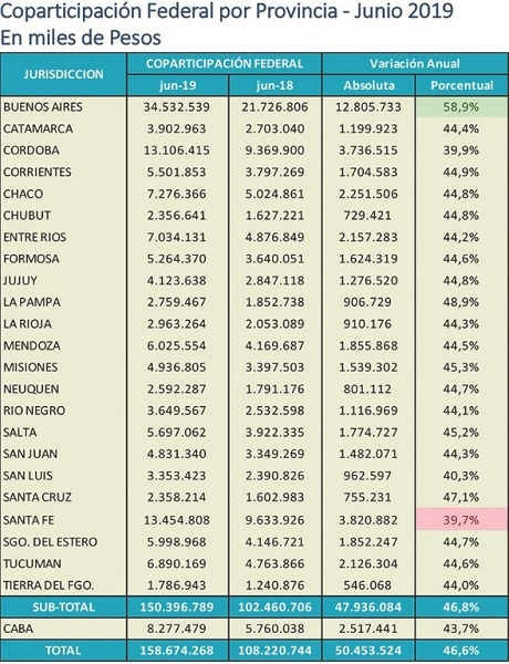 Transcurrido el primer semestre de 2019, la Coparticipación de Nación a las provincias acumula un 51,1% de incremento interanual, lo que implica tres puntos porcentuales menos respecto al avance de la inflación acumulada para el mismo período.