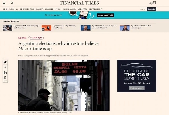Luego del sorprendente triunfo de Alberto Fernández, los analistas e inversores vislumbran una situación sombría para la coalición gobernante. Así lo refleja un artículo del más reputado e influyente diario económico del mundo, el Financial Times.