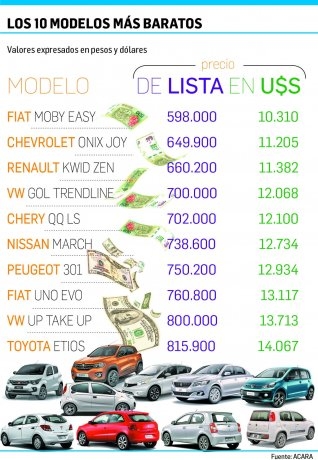 Ayer, la asociación que agrupa a las concesionarias de autos (ACARA) difundió los precios actualizados de todos los 0 km. Si se toman los 10 más accesibles -con los aumentos de enero y un dólar planchado- ya no quedan modelos de menos de u$s10.000 a la cotización oficial. Este lote de vehículos se ubica en una franja que parte de ese piso y supera los u$s14.000. Se utilizó la punta vendedora, que es a la que le tomarían la moneda extranjera a quien quiera desprenderse de los billetes. Obviamente, si se vende en el blue el valor sería menor, pero se trata de una operación ilegal. En este caso y accediendo a los descuentos, el precio de estos 0 km. bajaría a unos u$s8.000.