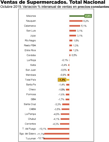 En octubre Misiones logró duplicar la mejora de septiembre y alcanzó un alza de 7,3% en ventas en supermercados, según otro informe de la misma consultora, y volvió a ser la provincia con mayor crecimiento en ventas del país.