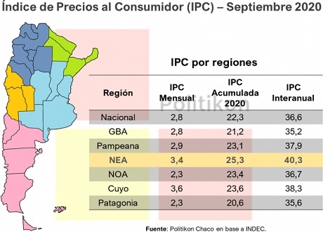 A su vez, en el acumulado del año 2020 (tal como se viene observando en los últimos meses), la región del NEA registra la inflación más alta del país con un alza de los precios que llega al 25,3%.