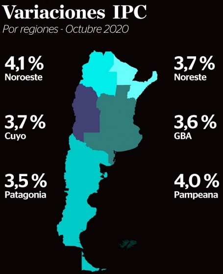 Como consecuencia, el IPC subió allí 4,1% seguido de la región Pampeana donde trepó 4%. En Cuyo y el Noreste los precios subieron 3,7%; en el Gran Buenos Aires, 3,6% y en la Patagonia anotaron una suba del 3,5%.