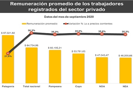 Observando por regiones, la Patagonia tiene una remuneración promedio de $87.021,92, la mayor del país pero que tuvo el incremento anual a precios corrientes más bajo del país (21,6%); le sigue la región Pampeana con $60.195,31 (+35,3% anual), Cuyo con $53.781,63 (+35,8%), el NOA con $47.043,47 (+35,6%) y el NEA muestra las remuneraciones privadas registradas más baja del país con $46.200,66 (+35,3%).