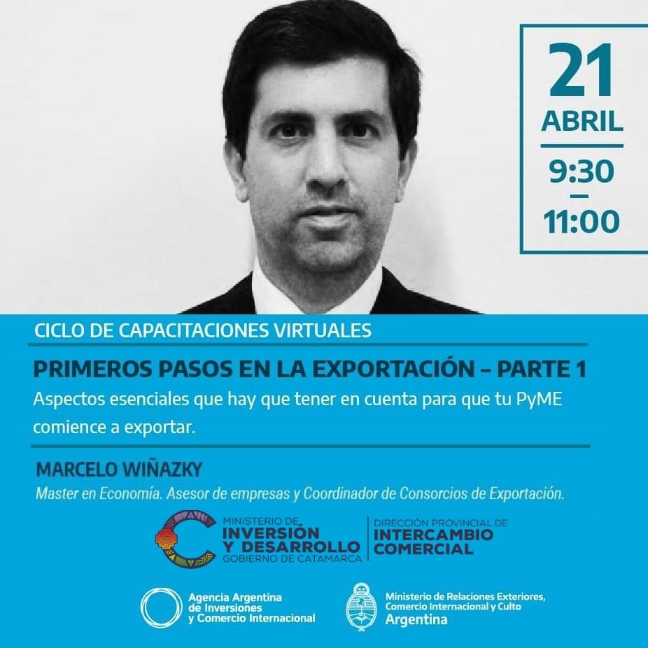En esta oportunidad, la invitación es para participar de la segunda actividad del Ciclo Virtual, denominada "Primeros pasos en la exportación (parte 1)", la cual se llevará a cabo el martes 21 de abril de 9.30 a 11.00 hs. y estará a cargo del Master en Economía, Marcelo Wiñazky, quien desarrollará temas tales como: ¿Qué vender?, Posición arancelaria, Barreras al comercio exterior, Mercados exteriores, Primeros pasos en la exportación, Desarrollo de la actividad exportadora, entre otros.