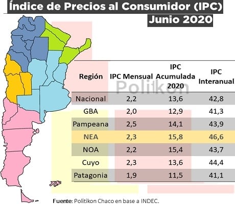 Además, en el acumulado 2020, ambas regiones continúan teniendo la inflación más alta del país con un alza de precios del 15,8% y 15,4% respectivamente; y poseen un índice interanual (junio 2020 vs junio 2019) de 46,6% en el NEA y de 43,7% en el NOA, según datos del INDEC, difundido por la consultora Politikom.