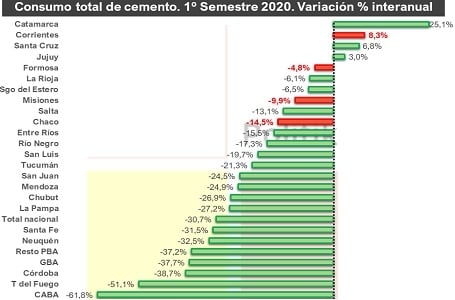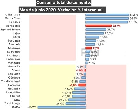 Los datos del mes de junio muestran una recuperación en el consumo de cemento en las provincias, e incluso algunas muestran subas interanuales pese al impacto de la pandemia en la actividad económica, que muestra caídas en los datos acumulados del 1º semestre, según la Asociación de Fabricantes de Cemento Portland, reproducidas por la consultora Politicom.