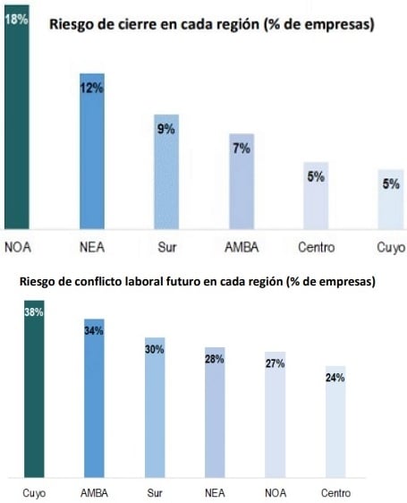 La región con mejor desempeño es Centro, donde sólo el 5% de las empresas corre riesgo de cierre y el 24% riesgo potencial de conflicto laboral futuro. AMBA muestra que el 8% de sus empresas corre riesgo de no sobrevivir y 38% riesgo de conflicto laboral. Se contrapone el NOA, con 18% de riesgo de cierre y 27% de potencial conflicto por intentos fallidos de concertación laboral y no homologación de los acuerdos sí logrados.
