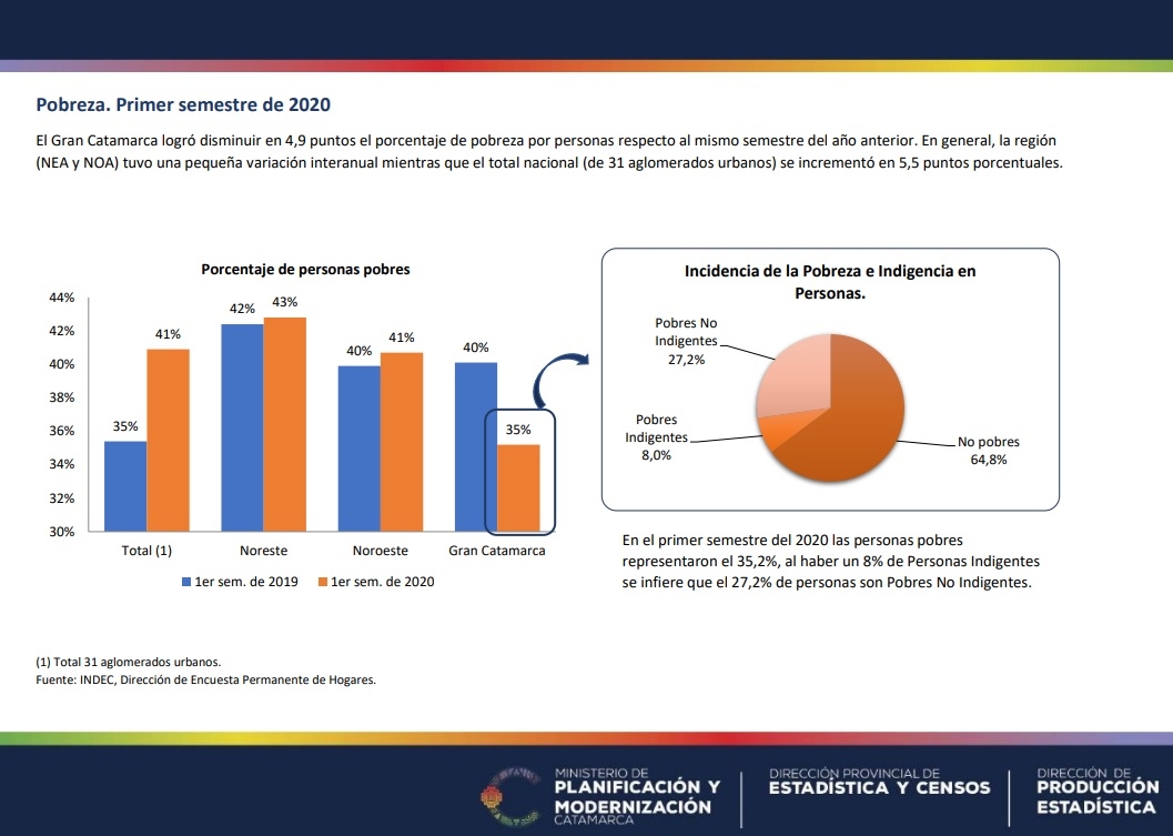 “Tomando como referencia al Gran Catamarca la pobreza pasó del 40,1 por ciento en 2019 al 35,2 por ciento en el primer semestre de 2020, dentro del cual un 8% corresponden a Personas Indigentes y el restante 27,2% a personas Pobres No Indigentes”, destacaron desde el organismo.