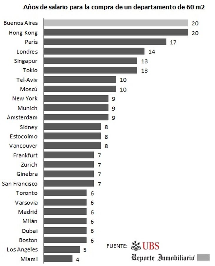 Los argentinos necesitan 20 años de ingresos para poder adquirir una propiedad en Buenos Aires, reveló un informe del Banco USB comparando los precios de las viviendas con los ingresos en 25 ciudades. Según el informe compartido por Mercado Inmobiliario, Buenos Aires se encuentra por encima del ranking de las ciudades más caras junto a Hong Kong.
