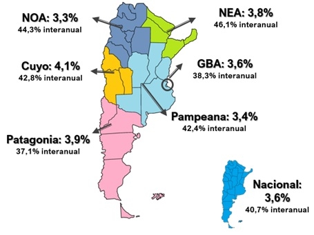 En el resto de las regiones, la mayor alza de precios de febrero se vio en Cuyo con 4,1%, seguido por la región de la Patagonia 3,9% y GBA con 3,6%, Pampeana con 3,4%.