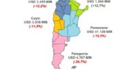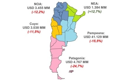 Según el informe de la consultora Politikon, a nivel nacional, en el mismo período, las ventas externas llegaron a u$s 54.884 millones de dólares, cayendo un 15,7% a nivel interanual. En este marco, la región Pampeana concentró el 74,9%, seguida por la Patagonia (8,7%), NOA (6,3%), Cuyo (5,5%) y el NEA tiene la participación sobre el total más baja (2,5%).