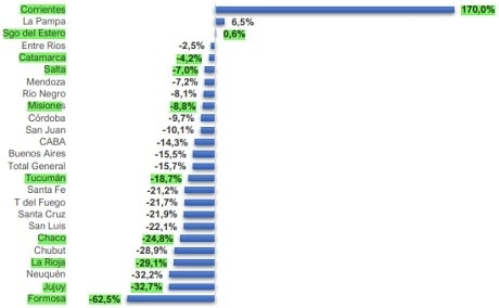 Por el contrario, Formosa mostró la mayor caída (-62,5%), seguida de Jujuy (-32,7%) y Neuquén (-32,2%).