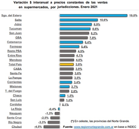El consolidado de las diez provincias que componen el Norte Grande Argentina tuvo ventas en supermercados en enero 2021 por un total de $11.163,5 millones, creciendo un 43,4% a precios corrientes respecto al mismo mes del año anterior; si se analiza la evolución a precios constantes (variación real ajustada por alza de precios), se observa un incremento en términos reales del 6,8% interanual, muy por encima del promedio nacional de 3,9%.