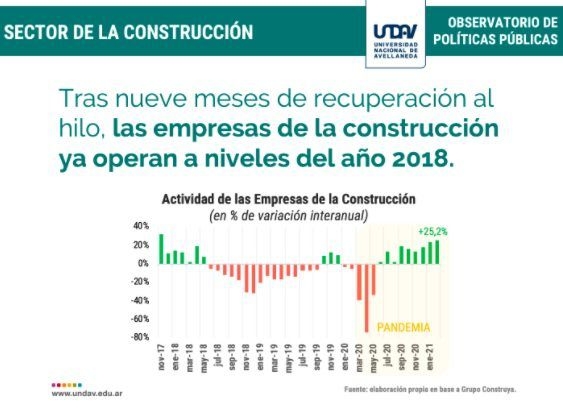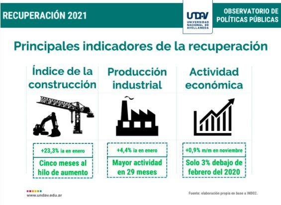 Así quedó en evidencia en el último informe del Observatorio de Políticas Públicas de la Universidad Nacional de Avellaneda (Undav) elaborado en base a datos oficiales. En ese sentido la Undav destacó que el Estimador Mensual de la Actividad Económica (EMAE) creció por octavo mes consecutivo en diciembre. La actividad económica se incrementó un 0,9% en relación a noviembre y presentó la menor contracción interanual (-2,2%) desde febrero 2020. Por otra parte, a nivel sectorial se observa que seis sectores del EMAE crecieron de manera interanual en noviembre último. Entre ellos, dos muy relevantes para la generación de empleo y el crecimiento del mercado interno: industria y comercio (4,5% interanual y 10,7% interanual. respectivamente).