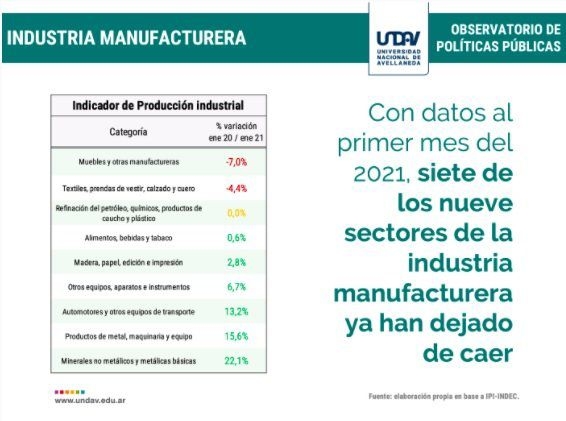 Según la Undav la producción de las pymes industriales, que mide la Red-CAME, viene mostrando un comportamiento similar a la de la industria general que mide el INDEC. De hecho, en enero del 2021 la producción pyme creció un 0,3% interanual resultando el segundo mes consecutivo de crecimiento. Además, la proporción de pymes industriales con rentabilidad positiva alcanzó el 47%.