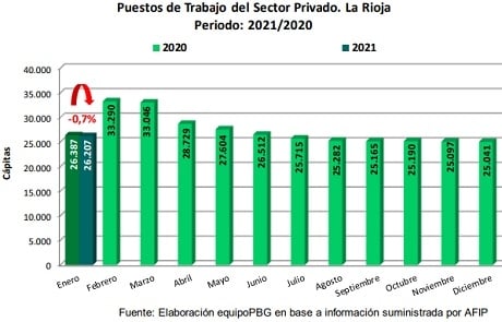 Asimismo, La Rioja perdió 180 fuentes laborales privadas entre enero de 2020 y el mismo mes de 2021. Se trata de una caída interanual del 0,7%.