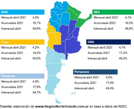 A nivel regional, según un informe de www.RegionNorteGrande.com.ar realizado con datos del Indec, la mayor alza de precios de abril se vio en la Patagonia, que creció un 4,8% mensual. Le sigue la región de Cuyo con 4,2%. La región del NEA y el GBA crecieron un 4,1%, y la Pampeana y el NOA lo hicieron en un 4%.