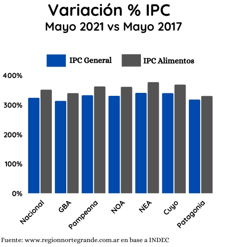 En la región del NEA, los alimentos tuvieron un crecimiento entre mayo 2017 a mayo 2021 del 377,4%, el más alto de todo el país, dato que se agrava al cruzarlo con otros dos: esa misma región es la que tiene los menores salarios de la región, y donde los hogares deben destinar la mayor porción de sus ingresos solo a la compra de alimentos.