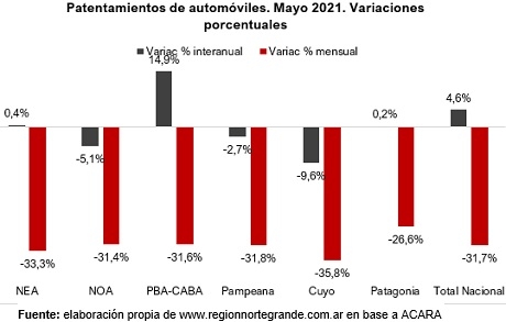 Según un informe de Región Norte Grande, a nivel regional se observa que la comparación interanual (vs mayo 2020), solo el NEA, PBA-CABA y la Patagonia registraron crecimientos, pero en diferentes volúmenes.