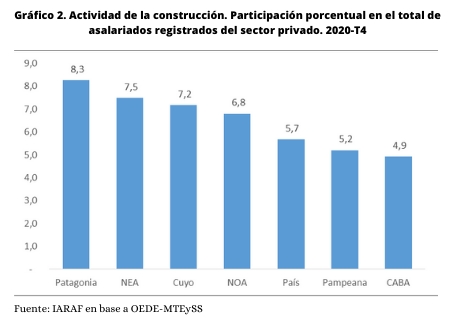 Con respecto a la estructura productiva formal privada, se aprecia que a nivel país la construcción participa con el 5,7% (cuarto trimestre de 2020). Al considerar por regiones, la construcción tiene una mayor participación en la Patagonia (8,3%), NEA (7,5%), Cuyo (7,2%) y NOA (6,8%). Con menor participación se encuentran la región Pampeana (5,2%) y CABA (4,9%).